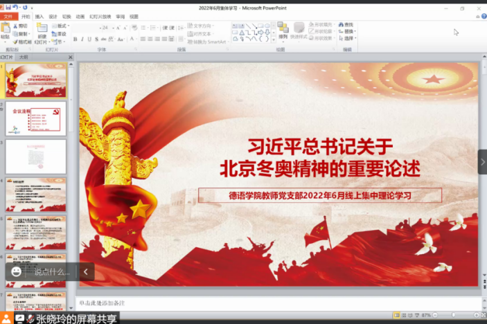 2022年6月29日下午,六合宝典下载 教师党支部召开线上会议,集体学习领悟习近平总书记关于北京冬奥精神的重要论述。