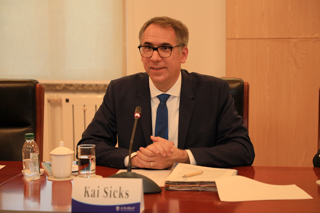 10月14日,德国学术交流中心(DAAD)秘书长凯·西克斯(Kai Sicks)一行访问北京外国语大学,北外校长、党委副书记贾文键会见代表团一行。