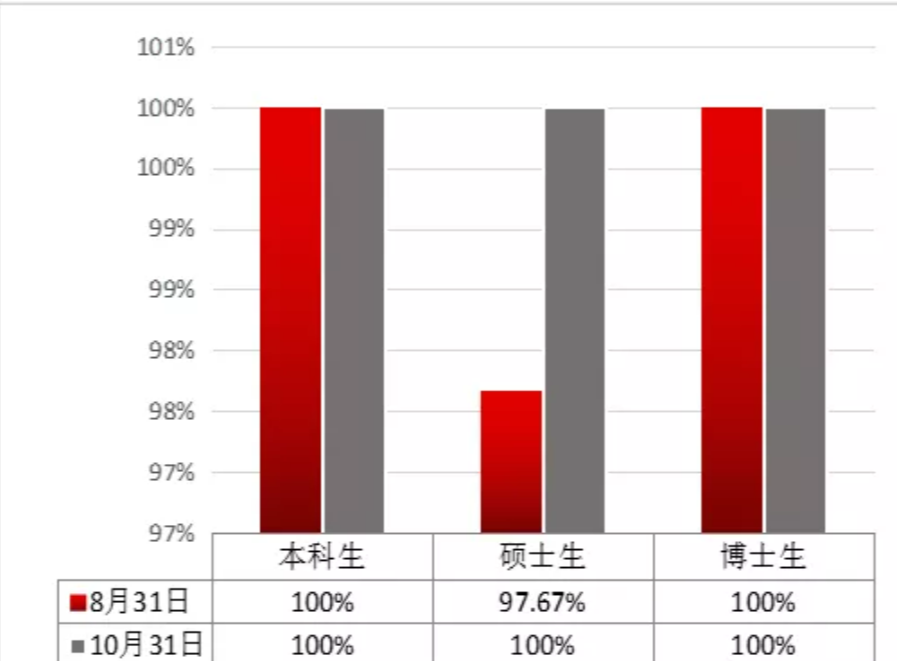2019-2020学年,在学校党委的正确领导下,我院认真贯彻落实党中央和学校就业工作要求,探索全员、全方位、全过程的“三全就业模式”,师生同心,群策群力,攻坚就业难题。疫情期间,我们制定“抗疫情、促就业”工作方案,从“稳就业、清意向、扩领域、新方法、推实策、导方向”等六个方面,扎实开展就业工作。截止8月31日,本科生初次就业率为100%,硕博研究生初次就业率为97.67%。截止10月31日,本科生、研究生就业率均为100%,总体就业率为99.57%,居全校第二,比2019年毕业生就业率提升了15.26%。