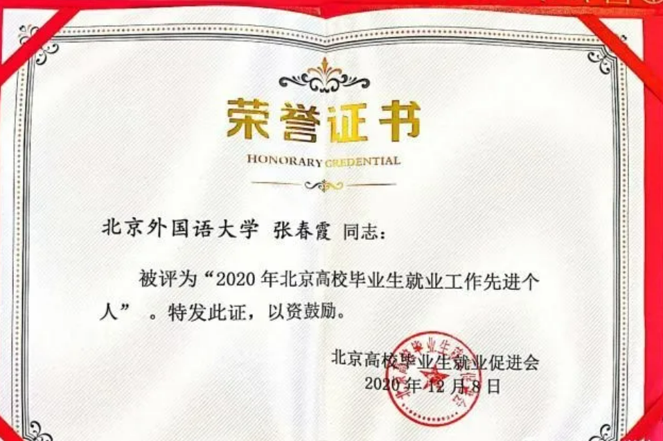 我院教师张春霞荣获“2020年北京高校毕业生就业工作先进个人”以及“2020年北京外国语大学就业工作先进个人”等两项荣誉称号。张春霞老师作为获奖代表在总结会上发言。
