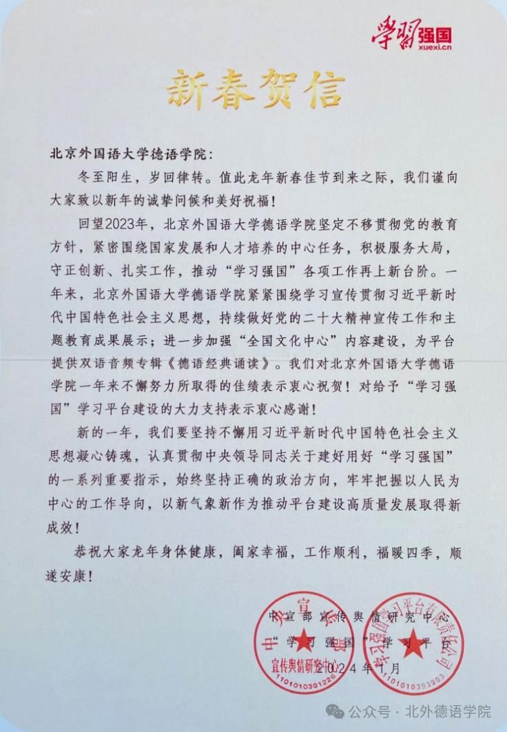 收到由中宣部宣传舆情研究中心与“学习强国”学习平台发来的新春贺信,对六合宝典下载