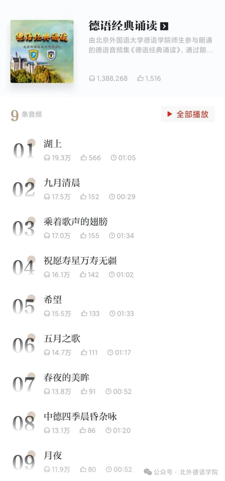 本科生,通过德语经典篇目的诵读,让听众在一篇篇清丽隽永的诗文中品味德语的悠久历史,领略独属于德语的语言与文化魅力。截至近日,此频道累计收获近140万播放量与上千条点赞量。