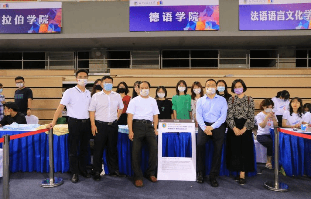 领导、参与迎新的学生们合影留念。