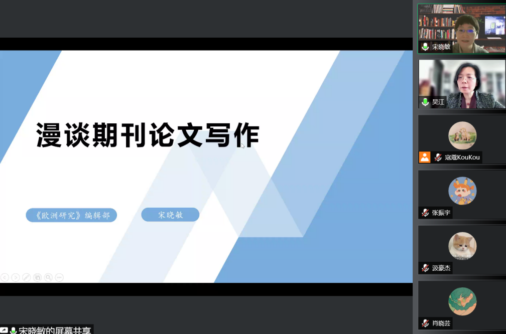 宋晓敏老师从汉字——“困”的解读入手,别开生面地引入到讲座主题,接着结合自身丰富的编审经验以及论文范例,对如何寻找研究问题、如何做好研究综述以及如何寻找研究视角与研究方法等进行了细致讲解。宋晓敏老师指出,既可以从经典中发现研究问题,也可以从梳理文献中挖掘研究问题,与此同时还可以运用新理论形成新的研究问题,或者关注时事热点获得灵感寻找研究问题。随后宋晓敏老师依次就引言、正文和结论的写作规范提出了建议,并以刊发在《欧洲研究》上的论文为例进行了具体分析,鼓励师生善于发现学术增长点,科学地运用研究方法进行论证,使研究更具思辨性。报告的最后,宋晓敏老师对《欧洲研究》期刊及其编审原则进行了介绍,并为师生推荐了可行的研究选题。