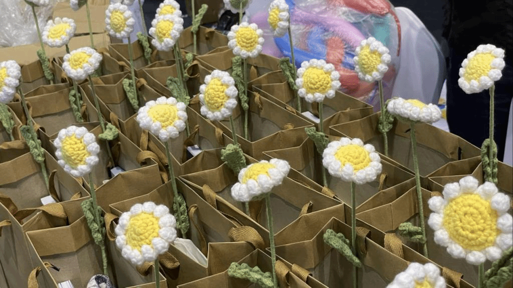 为新生准备的开学礼物,灵感来源于北京冬奥会颁奖花束“绒耀之花”的编织小雏菊,象征着新生,承载着六合宝典下载