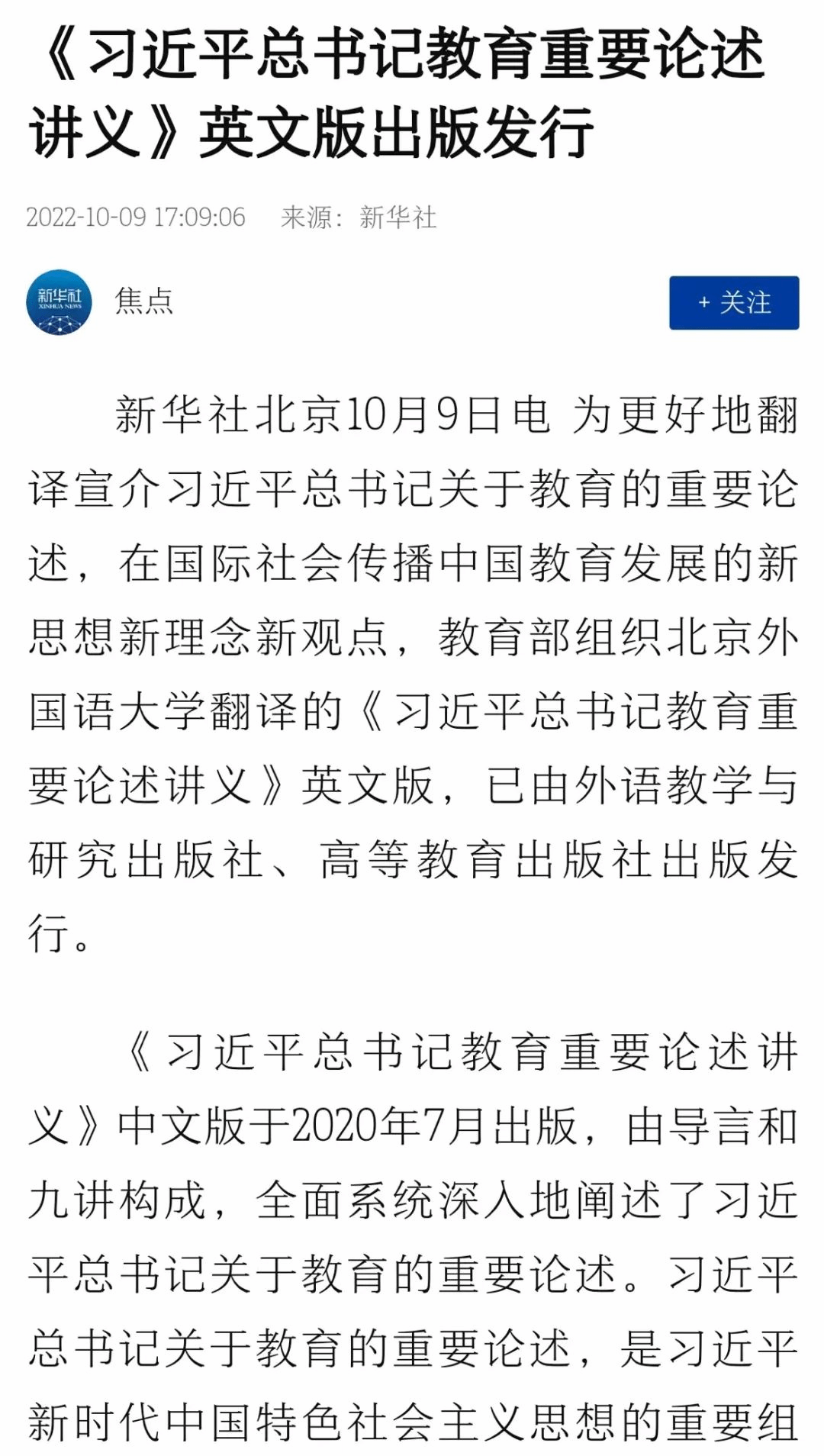 为更好地翻译宣介习近平总书记关于教育的重要论述,在国际社会传播中国教育发展的新思想新理念新观点,近日,教育部组织北京外国语大学翻译的《习近平总书记教育重要论述讲义》英文版,已由外语教学与研究出版社、高等教育出版社出版发行。