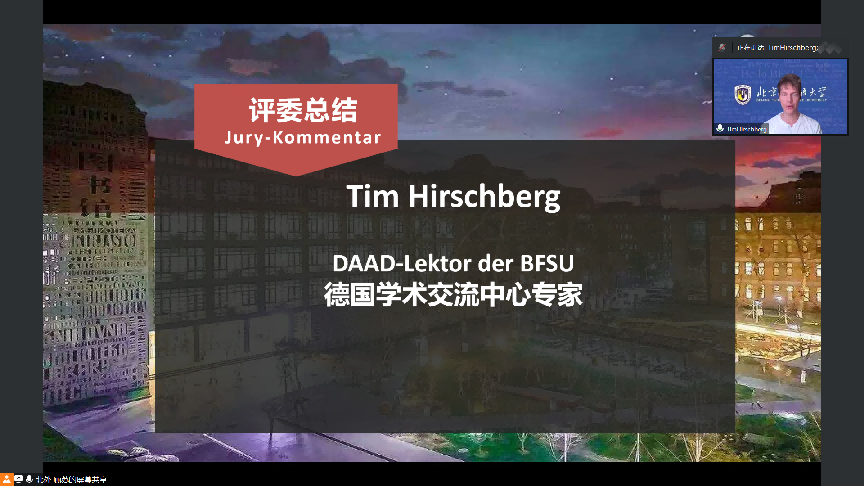 大赛初赛于9点30分准时开始,评委团队采取交叉回避原则分组对参赛作品进行了评审。经过激烈的角逐,共有12支参赛队伍晋级决赛。西南交通大学德语系主任何俊副教授以及北京外国语大学德国学术交流中心专家Tim Hirschberg代表全体评委对本次大赛的参赛作品进行了精彩的点评。选手们通过优美的声音传递出对“故乡”的不同理解,精彩的演绎给评委们留下了深刻的印象,给这个美好的春日增添了无尽的遐想,令人回味无穷。