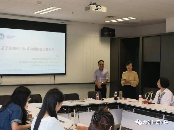 在报告的第三部分,张斌介绍了认知和用法导向的构式语法观对德语教学的启示,其中重点讲解了Herbst(2016)提出的Pedagogical Construction Grammar中的七个实操原则。同时他还建议,德语教学者在实际教学中通过语境将词汇、语法以“打包”的形式呈现给学生,以更好提升德语学习者的学习动力以及语法、语义和语用意识。最后,张斌结合自己的实际经历提出了两个问题:我们究竟需要什么样的语法和语法观?语言使用者的身份认同问题与语法规范的互动应是怎样的?这些问题引起了在座师生的思考和热烈讨论。
