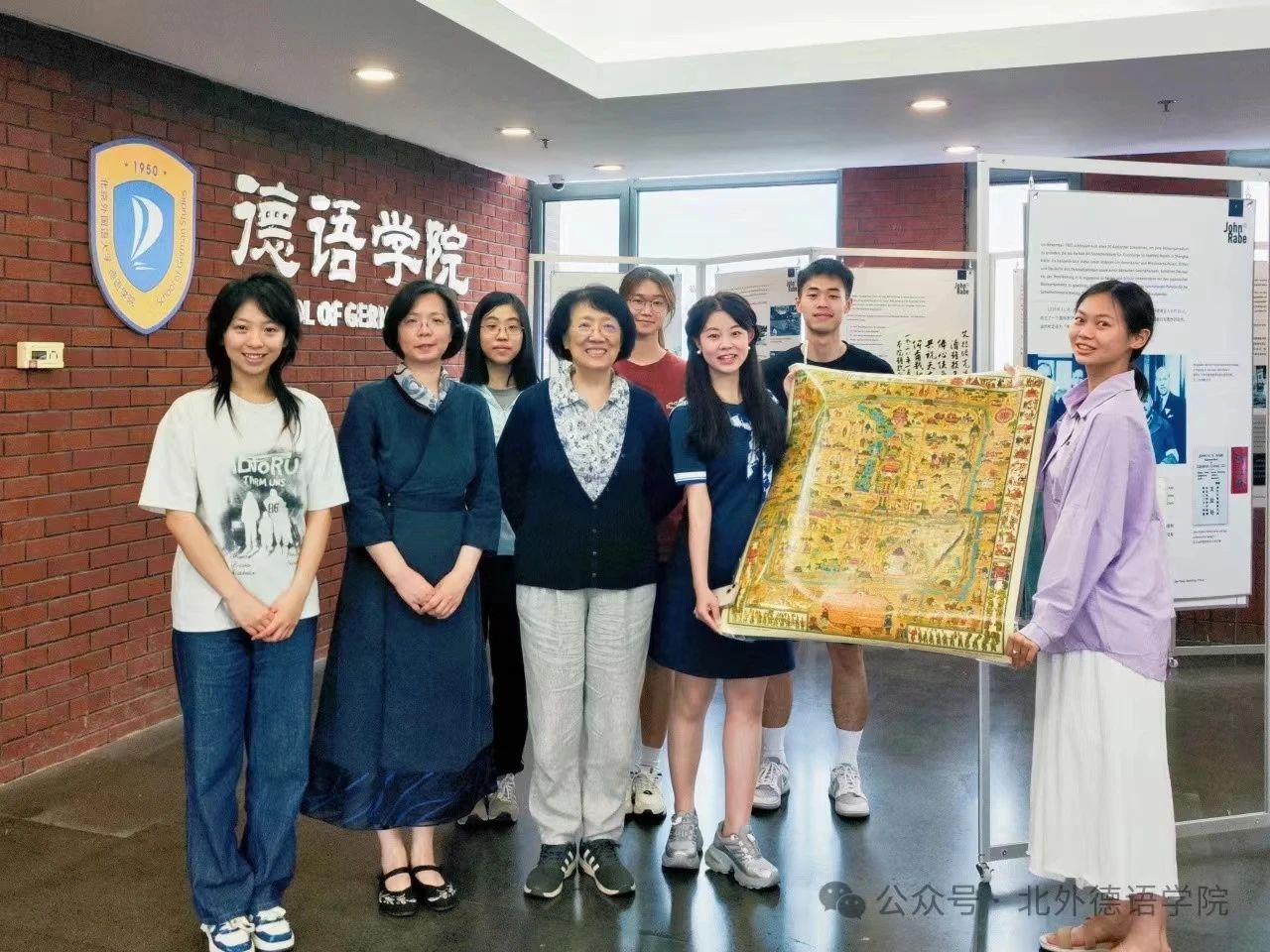 正在展出的“约翰·拉贝事迹展”展板前合影留念。师生纷纷表示,梁怡教授谈吐优雅又不失幽默,报告内容全面、资料详实,令人获益匪浅。