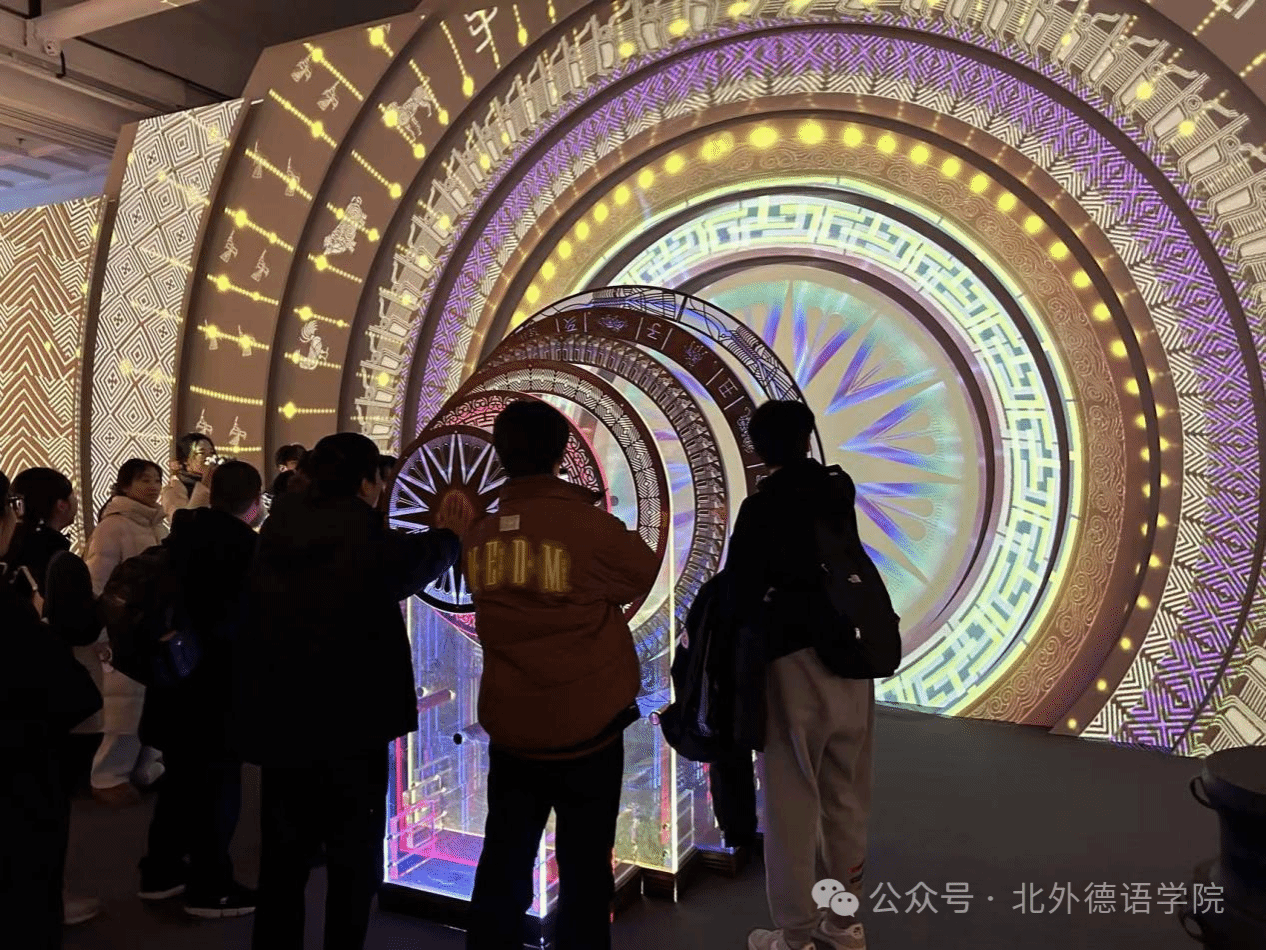 随后,同学们来到第二单元“大交融”展厅,透过文化、经济、情感三个视角,探寻中华民族交往交流交融的发展脉络。从展厅纱幔上呈现的西域交通图,到脚下动态展示的丝路古道,同学们仿佛置身于历史长河中,亲历中华民族在融合中壮大的宏大历程。这不仅让大家对中华文化的包容性有了全新认识,也进一步体会到了中华民族团结一心的强大力量。