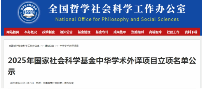 近日,全国哲学社会科学工作办公室公示了2025年度国家社会科学基金中华学术外译项目立项名单。我院赵倩副教授申报的《生熟有度》德译项目获2025年度国家社科基金中华学术外译项目立项。