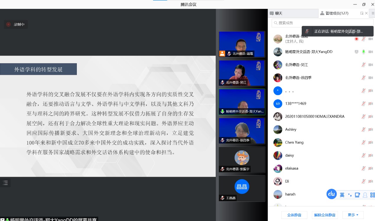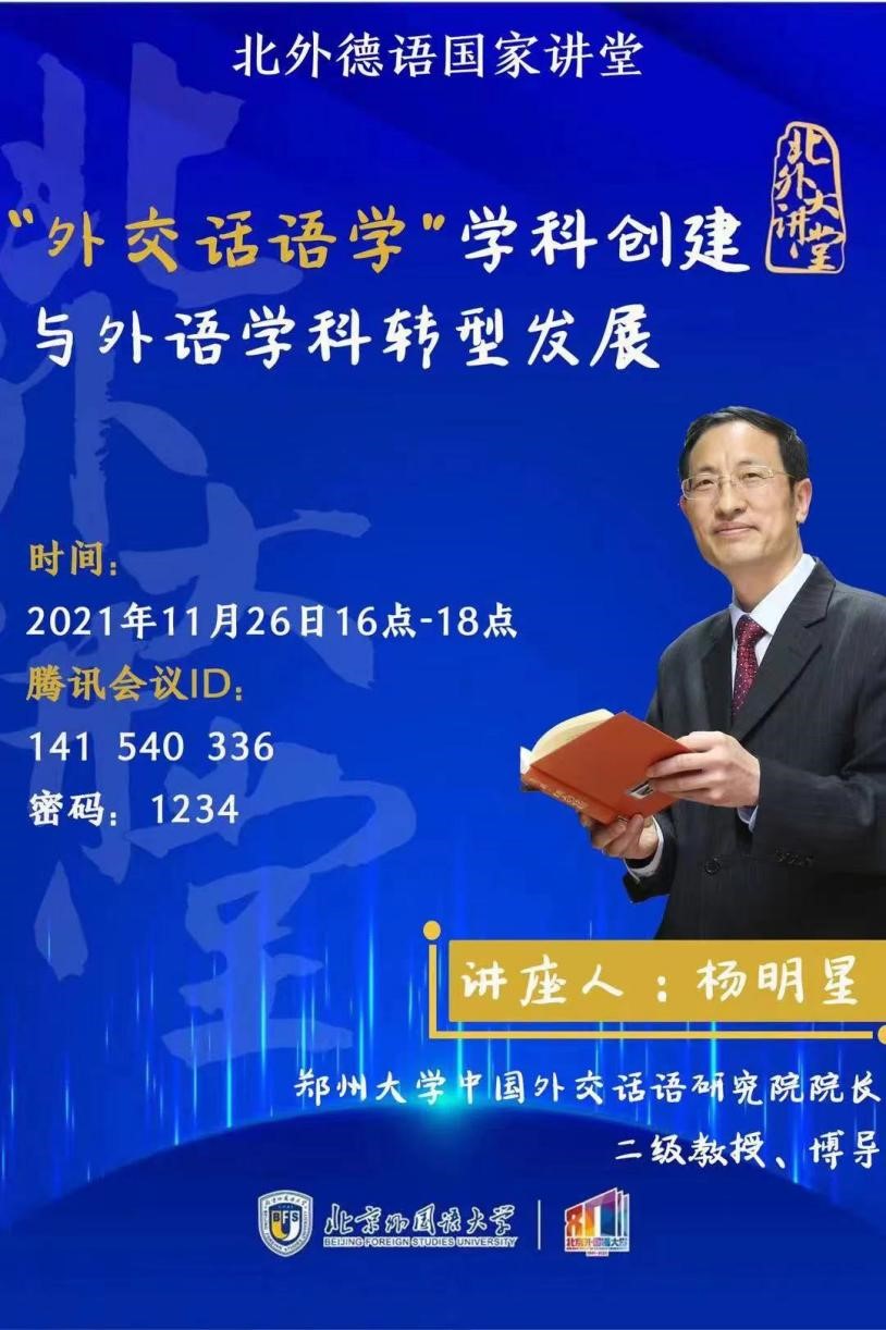 20211126日下午,北外德语国家讲堂以线上方式举行。郑州大学中国外交话语研究院院长杨明星教授应邀作了题为“‘外交话语学’学科创建与外语学科转型发展”的讲座。讲座由六合宝典下载 党总支副书记、院长吴江教授主持。来自全国各高校的120余位师生参加了讲座。