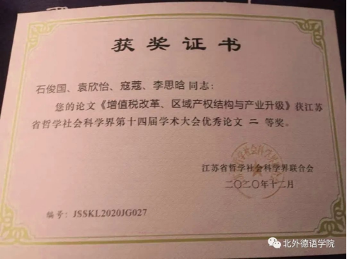 讲师寇蔻博士与石俊国(江苏大学)、袁欣怡(东北大学秦皇岛分校)以及李思晗(西班牙瓦伦西亚理工大学)共同撰写的论文《增值税改革、区域产权结构与产业升级》获江苏省哲学社会科学界第十四届学术大会优秀论文二等奖!