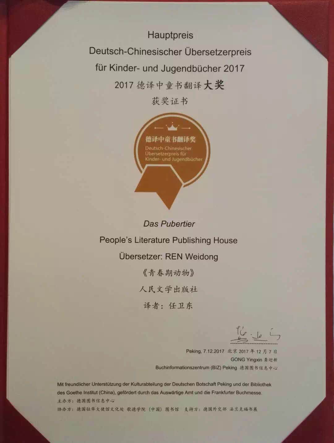 2017年12月7日,“2017德译中童书翻译奖”在北京揭晓,北京外国语大学德语系教授任卫东荣获大奖。