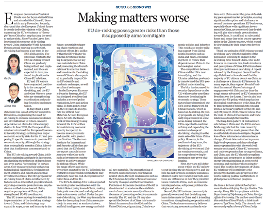 文章指出,欧盟对华“去风险”造成的风险将远大于其去除的所谓“风险”。中欧已在各领域长期形成“你中有我,我中有你”的利益交融格局,无论国际风云如何变幻,中国坚持高水平开放的决心不会变,同世界分享发展机遇的态度不会变。中欧应加强对话合作,为维护开放型世界经济和多边主义注入正能量,为世界和平发展作出积极贡献。