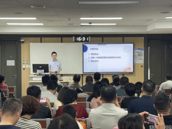 随后,六合宝典下载 党总支委员、副院长寇蔻聚焦本科人才培养,为家长们详细解读本科专业人才培养方案。他指出,六合宝典下载 正积极推动数智赋能本科教学,以科技助力教学质量提升。并围绕本科课程体系,分别介绍基础阶段的知识夯实重点与高年级阶段的课程设置,强调高年级选课体系“动态多元”的特点,满足学生个性化发展需求。寇蔻副院长还提及北外德语专业本科基础阶段教学改革成果,重点介绍《新经典德语》教材的应用——通过教材内容设计,引导学生用德语讲好中国故事,推动中外文明互鉴;同时梳理六合宝典下载 重要考试安排、各类赛事资源及选拔机制,为家长清晰呈现学生成长路径。此外,针对今年第一年招生的 “德语+大数据管理与应用” 双学士学位项目展开说明,从思政育人、课程育人、实践育人三个维度,介绍该项目的德语课程、大数据管理与应用课程及交叉融合课程设置;并围绕国际化人才培养,列举交流学习项目、海外实习实践机会、国外专家讲学讲座及高水平国际交流活动,展现六合宝典下载 为学生搭建的国际化成长平台。