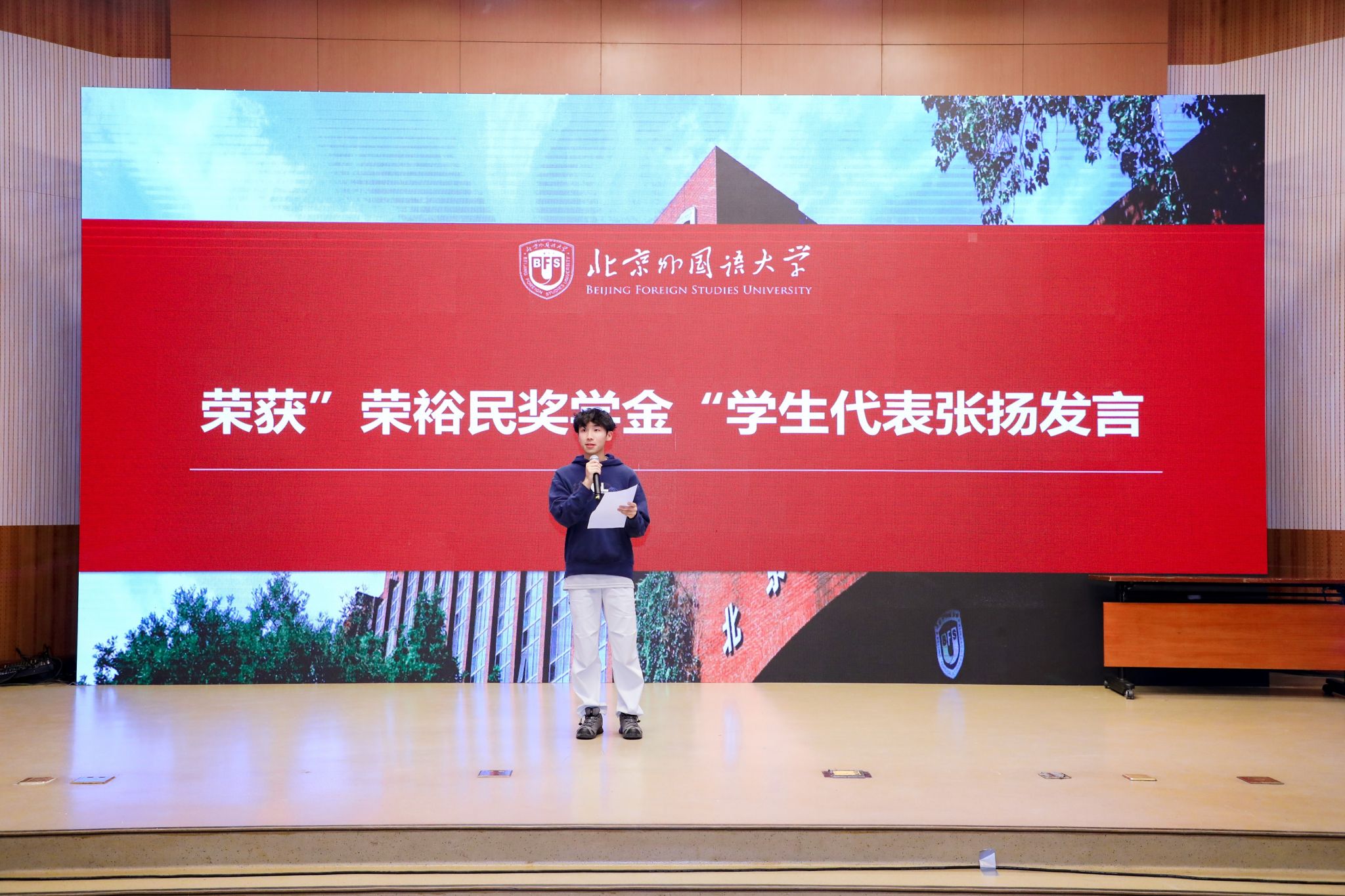 颁奖仪式举行前,他全程参与第四届德语学科区域国别研究高端学术论坛,并在致辞中表示将提高资助力度,支持更多母校德语学子“走出去”看世界。颁奖仪式上,荣裕民先生发表致辞。他结合自身求学、工作经历,深情讲述了设立基金的初心,强调德语作为跨文化交流桥梁的重要价值。他嘱托在场学子,要以扎实的专业素养立足国际舞台,以开放的视野联通世界,传承和平薪火,书写新一代北外德语人的精彩故事。同时,他对获奖同学表示热烈祝贺,鼓励全体学子坚守理想、深耕专业,不负时代使命与母校栽培。