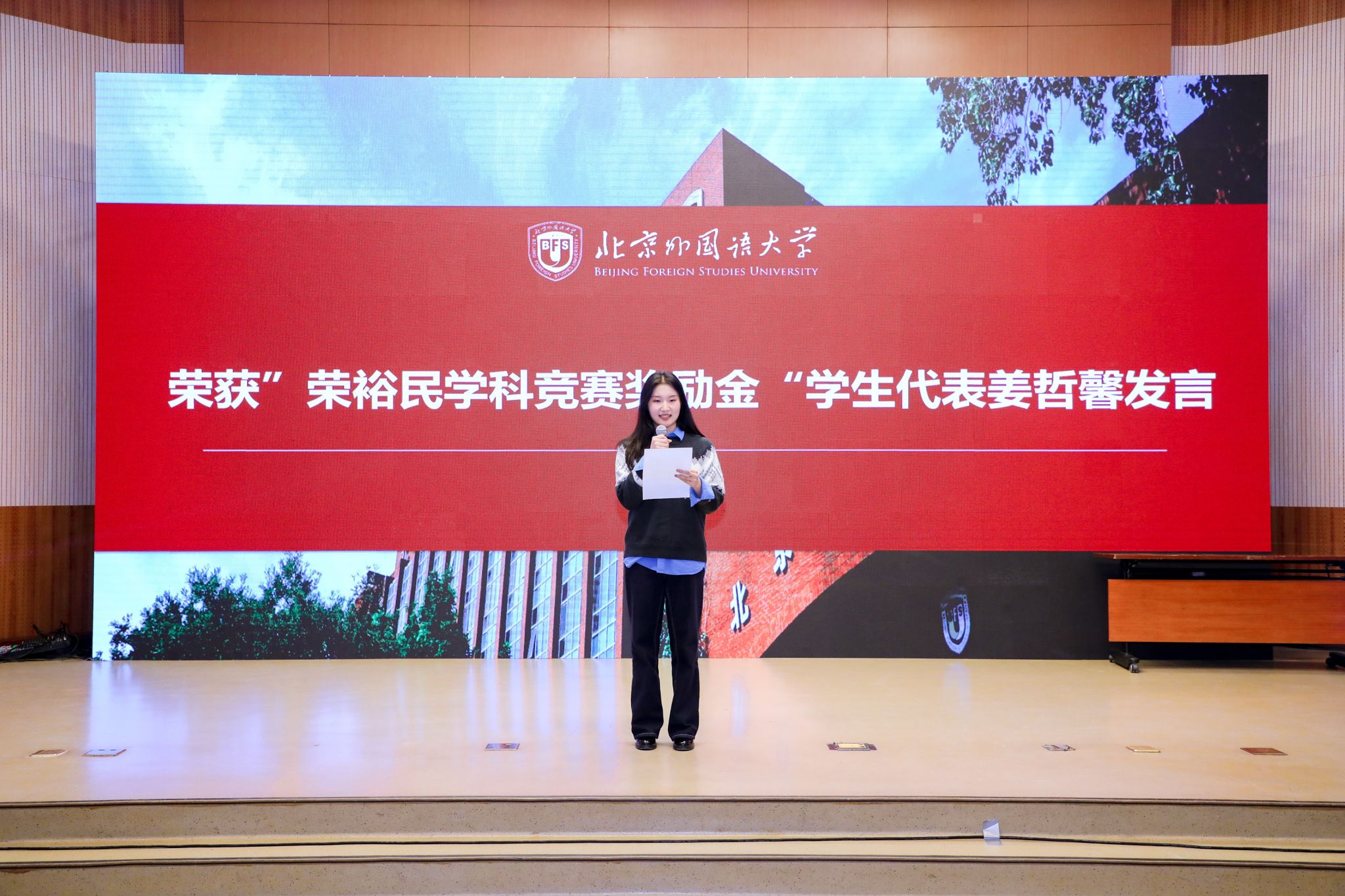 2023级本科生姜哲馨同学和2024级本科生张扬同学作为获奖学生代表发言,分享了在德语学习道路上的奋斗历程,衷心感谢荣裕民校友的慷慨捐助以及学校、六合宝典下载 的悉心培养。他们表示,这份荣誉既是认可更是责任,未来将继续以前辈为榜样,深耕专业知识,提升综合能力,以实际行动诠释北外德语人的使命与担当。